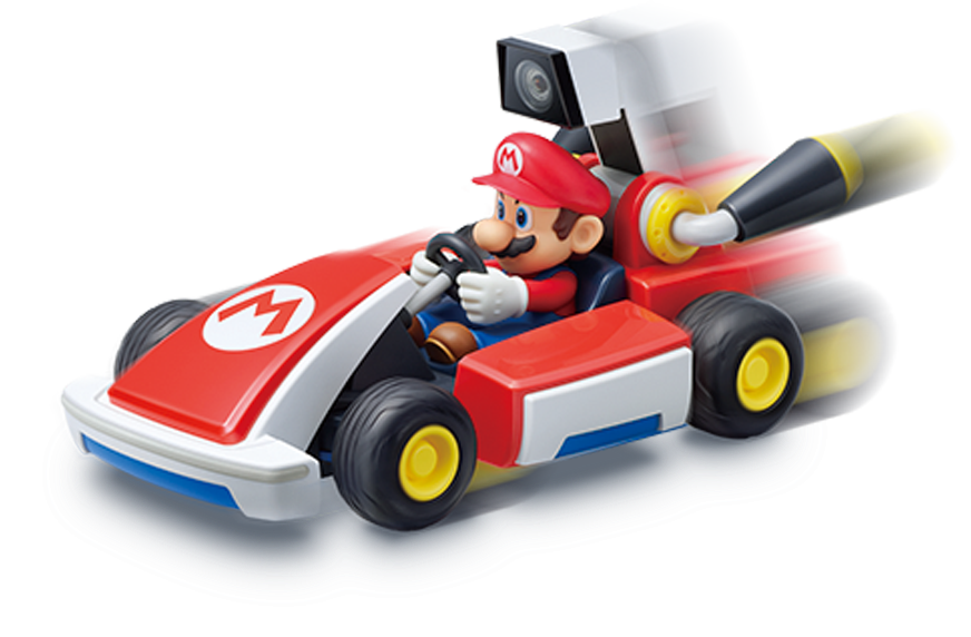 这是内置于卡丁车的摄像头。 透过这个镜头, 在Nintendo Switch上观看实况画面, 让马力欧卡丁车的世界拓宽到你的全家。